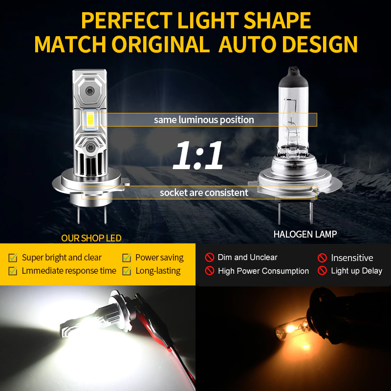 - Съотношение на страните 1:1 с халогенна лампа: Осигурява 300% по-ярка светлина с против отблясъци за другите участници в движението.