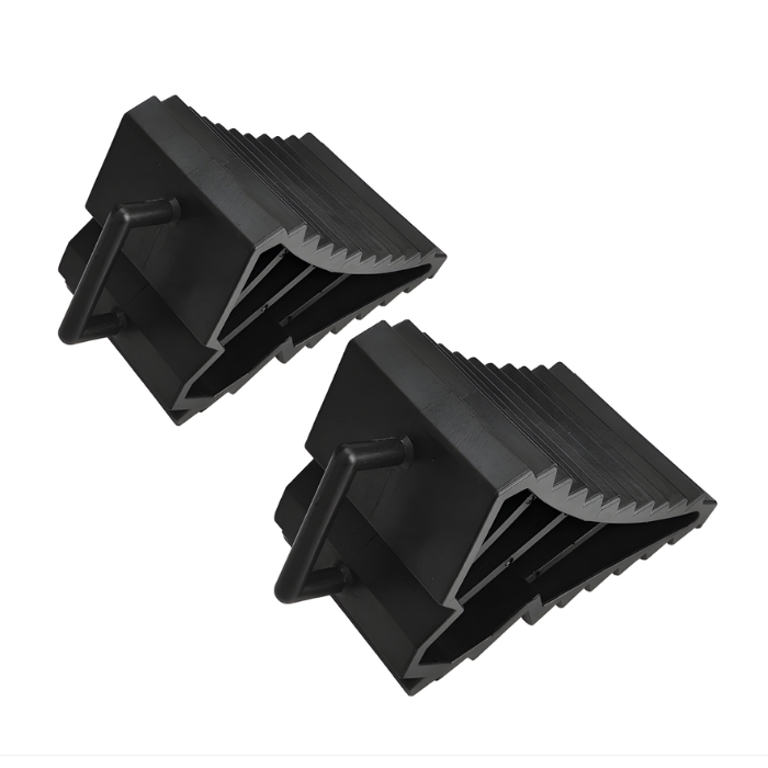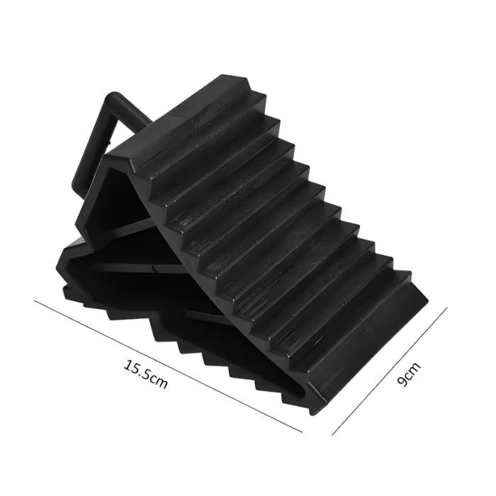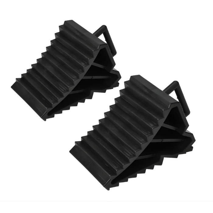 Практичен комплект от 2 стопери за гуми, предназначени да осигурят безопасност при паркиране или обслужване на превозни средства. Предотвратяват нежелано потегляне дори при наклонени терени.