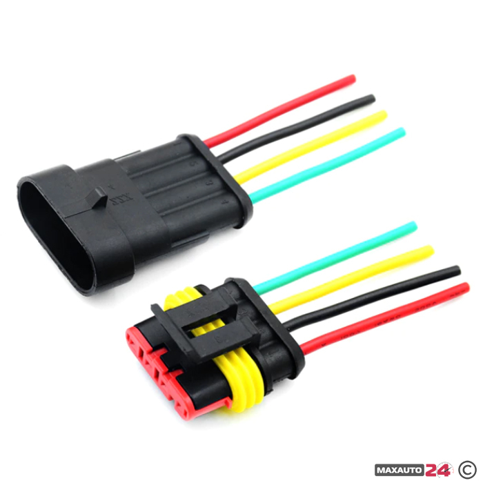 Този кабел е с четири пина и е предназначен за водоустойчиво свързване на електрически устройства или компоненти. Дължината му е 35 см, което го прави подходящ за различни приложения в автомобилната индустрия, електрониката или други области.