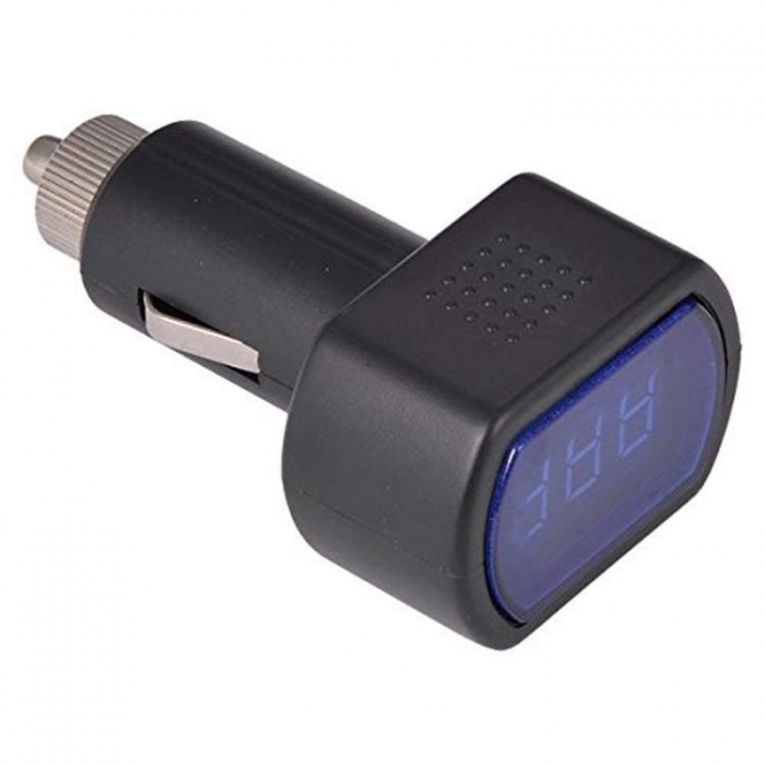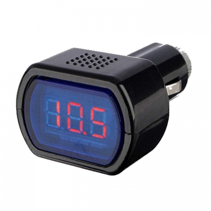 Това е описание на един ярък дигитален дисплей, който се включва директно в запалката на автомобила. Той може да измерва напрежение от 8 до 30 волта и има червен текст на екрана. Важно е да се отбележи, че за автомобили с напрежение от 24 волта не трябва да се използва повече от 90 секунди.