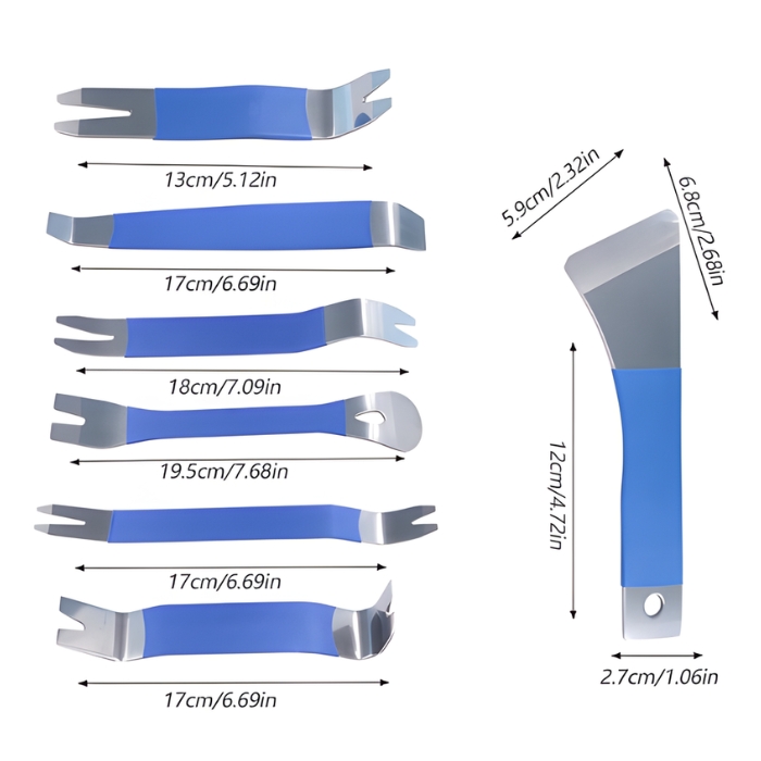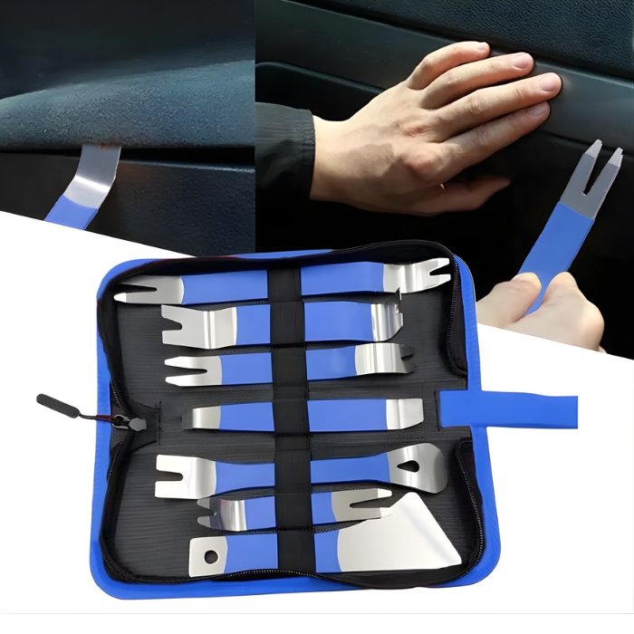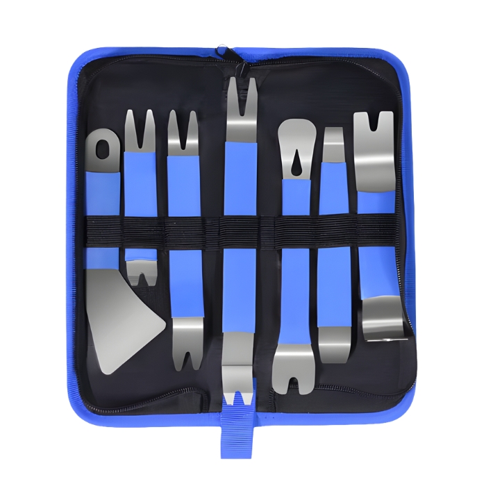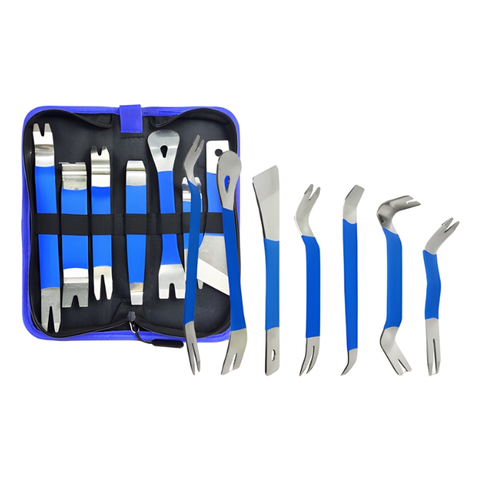 Практичен и надежден комплект инструменти за демонтаж на автомобилен интериор, създаден за бърза, безопасна и прецизна работа без риск от надраскване или повреждане на елементите.
