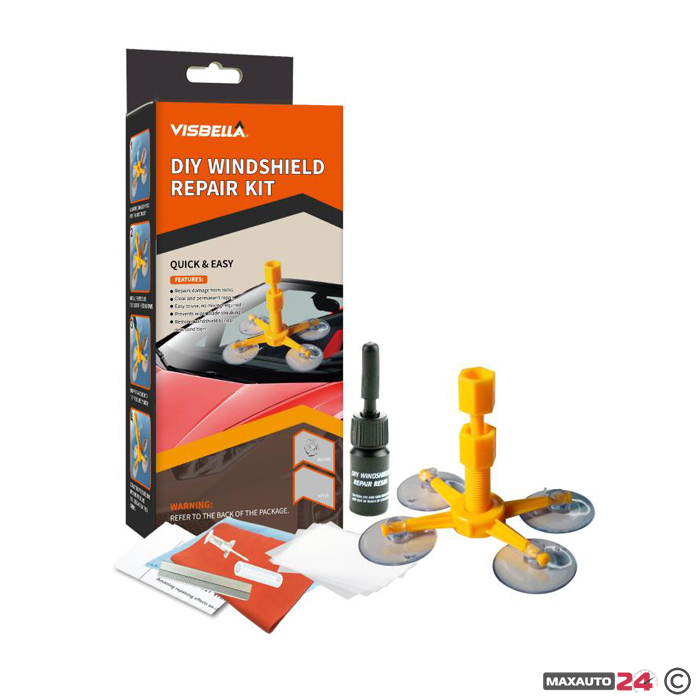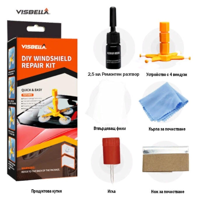 Ремонтният комплект Visbella® Windshield е специално създаден за бърз и ефективен ремонт на пукнатини в предното стъкло на автомобила. С него можете да отстраните повредата само за 20 минути. Комплектът е много лесен за употреба и намалява видимостта на пукнатините, като предотвратява тяхното разпространение.