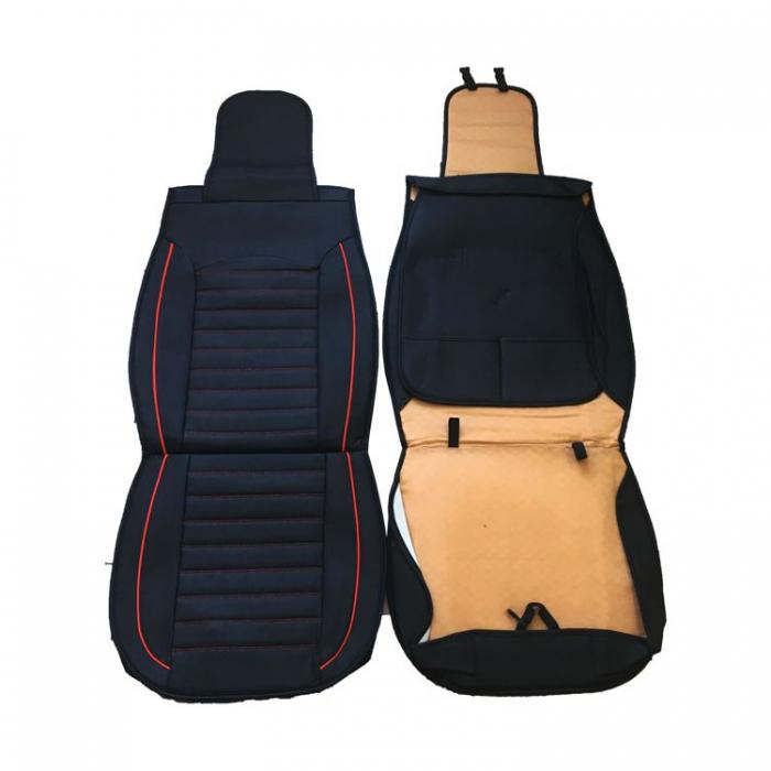 Комплектът универсални постелки за автомобил предлага отлична защита на седалките, докато същевременно придава нов и модерен вид на вашия автомобил. Изработен е от висококачествена дищаща ПВЦ кожа и пяна, което гарантира дълготрайност и комфорт. ПВЦ изкуствената кожа е издръжлива на физически третирания и осигурява по-добра защита на седалките. Монтажът е лесен и бърз, а материалът е лесен за почистване и може да се пере. Цветът е черно с червено, което допринася за стилния външен вид на автомобила.