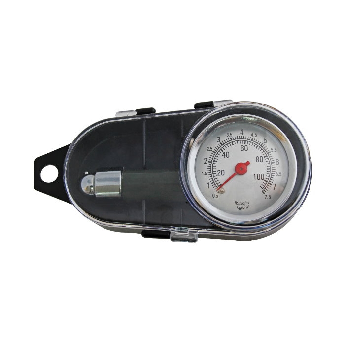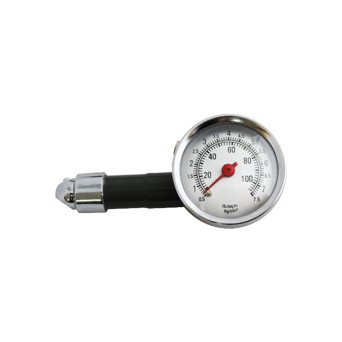 Описанието е за манометър, който е подходящ за използване на коли, мотори, колела и други превозни средства. Той разполага с лесно видима скала за отчитане на налягането в диапазон от 0,5 до 7,5 bar. Манометърът е оборудван със стандартна бърза връзка за удобно свързване и метална дръжка за устойчивост и удобство при употреба.