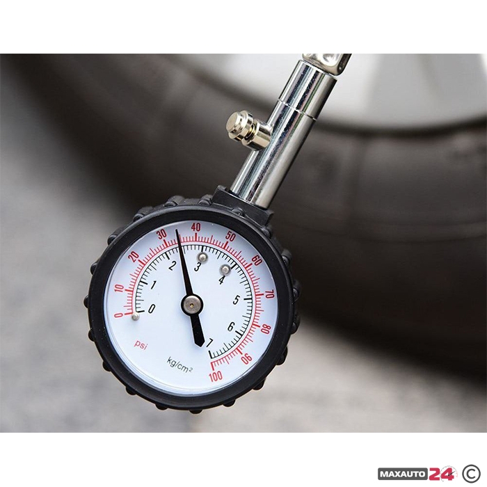 Манометърът е подходящ за различни превозни средства като камиони, автобуси, коли, мотори, колела и други. Има лесно видима скала за отчитане на налягането в диапазон от 0 до 100 psi и кг/см². Разполага с гъвкав маркуч, който позволява достъп до труднодостъпни места. Включен е спусък за коригиране на налягането. Връзката на накрайника е на резба. Този манометър е идеален за измерване на налягането в гумите.