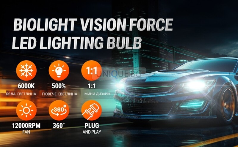 Ново поколение Мини диодни крушки BioLight за основни фарове и халогени на автомобили. Тези крушки са ERROR FREE, което означава, че ще работят без проблеми в автомобили с въведена CANBUS система (за автомобили, произведени след 2000 г.), без да се отчита грешка в компютъра на колата. Всяка крушка е с вградени високоскоростен тих вентилатор за охлаждане и платка за управление, осигурявайки високо качество и дълготрайност.