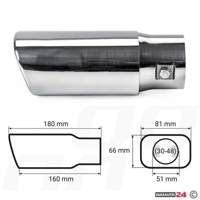 С монтажен диаметър от 30 до 48 мм, този накрайник е подходящ за различни модели и марки автомобили. Лесният и бърз монтаж се постига чрез затягане на специалните скоби, което позволява бърза инсталация без необходимост от специализирани инструменти или професионална помощ.