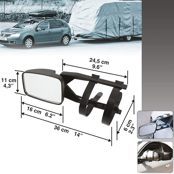 Това универсално помощно огледало е проектирано за по-безопасно и удобно шофиране при теглене на каравана, ремарке или платформа. То се монтира директно върху фабричното странично огледало на автомобила и осигурява разширено зрително поле, което значително улеснява маневрирането, изпреварването и движението в тесни участъци.
