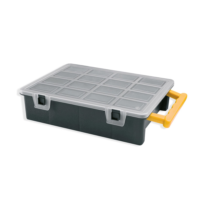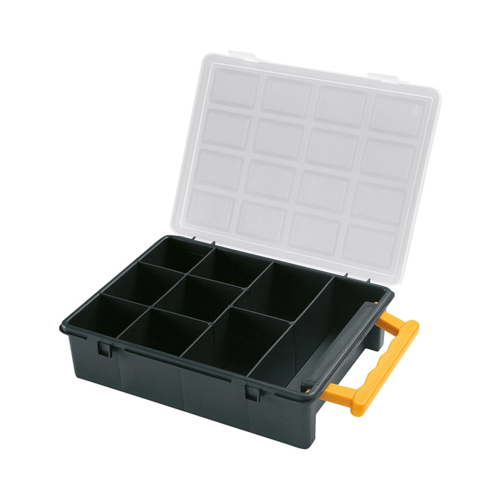 Тази пластмасова кутия с 9 отделения, капак и дръжка е идеално решение за съхранение на дребни инструменти, винтове, пирони, болтове и други малки предмети. Изработена е от висококачествена пластмаса, което я прави издръжлива и практична.