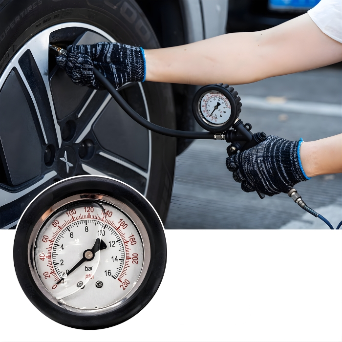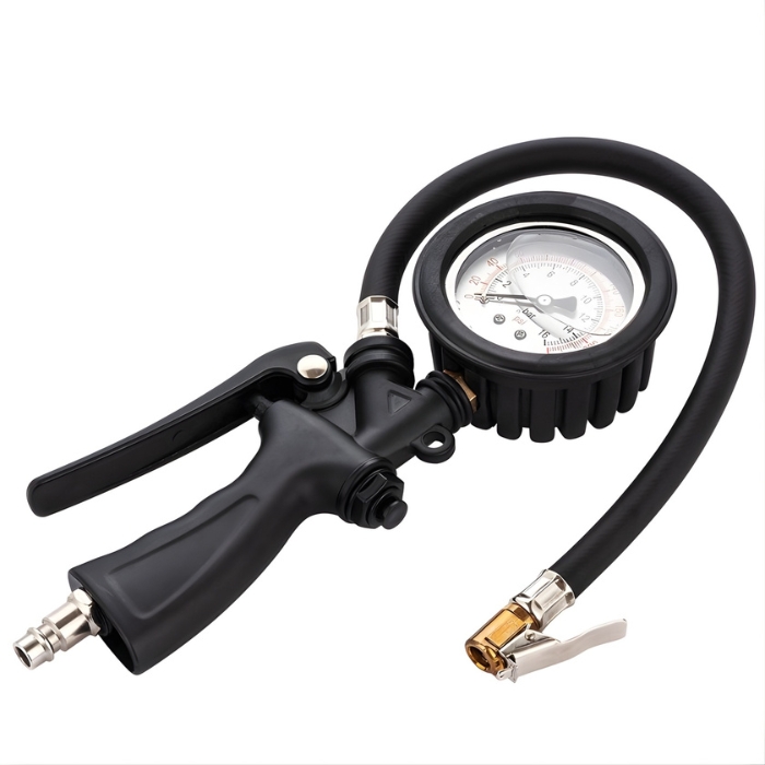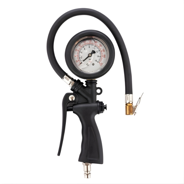 Практичен и надежден пистолет за помпане на гуми, оборудван с вграден манометър с маслено пълнене за максимално точни и стабилни показания. Подходящ за автомобили, мотоциклети, велосипеди и други превозни средства.