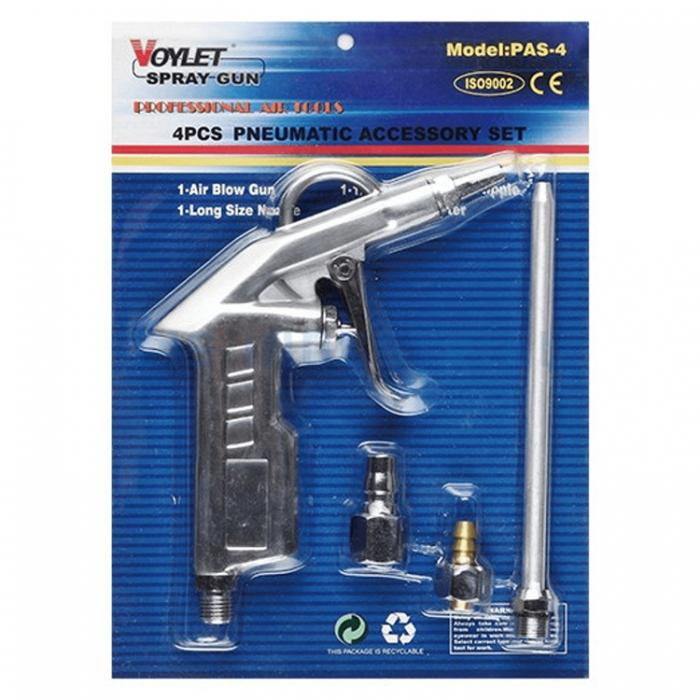 Този въздушен пистолет е създаден от висококачествен материал, който е здрав, безопасен, антикорозионен и издръжлив на употреба. Неговият дизайн го прави удобен и лесен за хващане. Пистолетът е подходящ за почистване на прах върху всяка машина, гаражна работилница, автомивка и сервиз. Той осигурява мощно издухване, като същевременно консумира по-малко енергия. В комплекта са включени дълъг накрайник и два адаптера за бърза връзка и маркуч, а продуктът се доставя в блистерна опаковка.