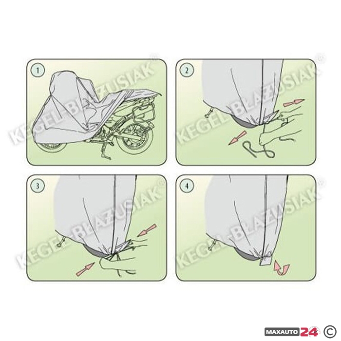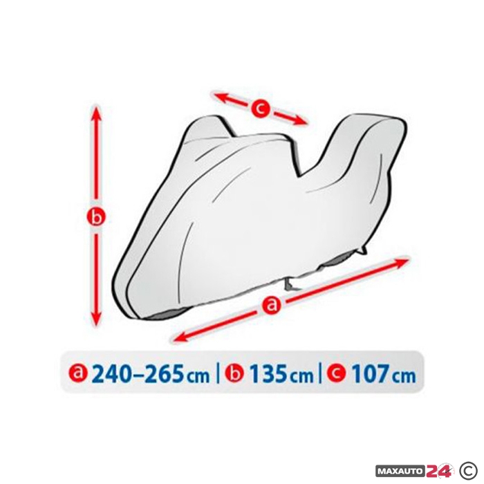 Модел: 06216. Този продукт е всесезонен и предназначен за защита от различни атмосферни условия. Предпазва от сняг, замръзване, дъжд, вятър, листа, дървесен сок, UV лъчи, птици, цветен прах и други външни влияния. Вътрешната мембрана е мека и не надрасква боята на превозното средство. Покрива цялото превозно средство и е лесен за съхранение и транспортиране, като не заема много място. Има множество механизми за закрепване към мотора, включително ластична лента и връзки.