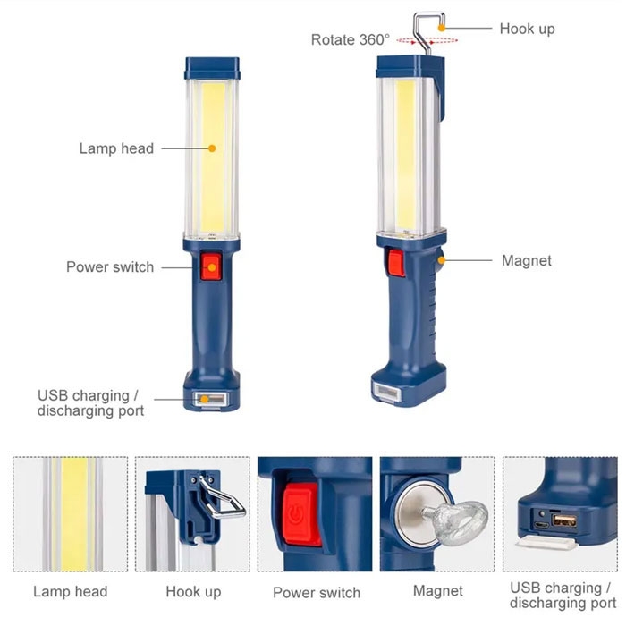 Описанието на многофункционалната работна лампа е както следва: