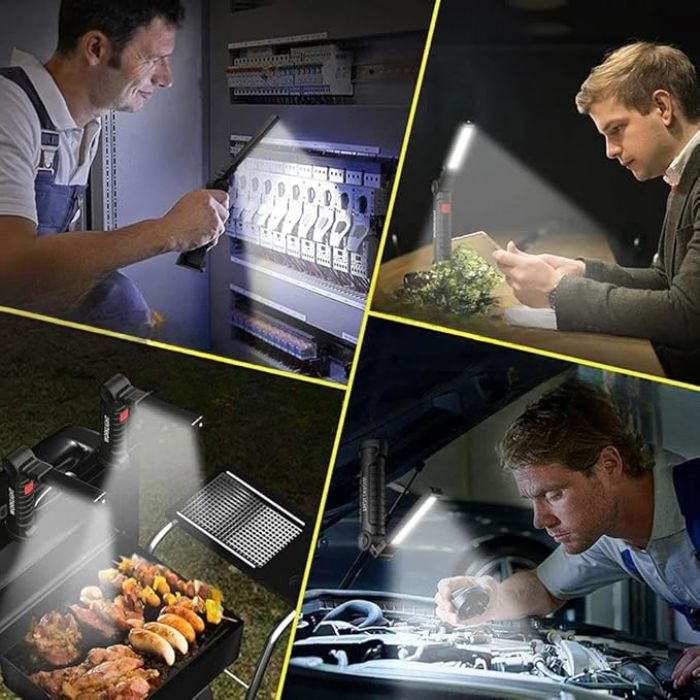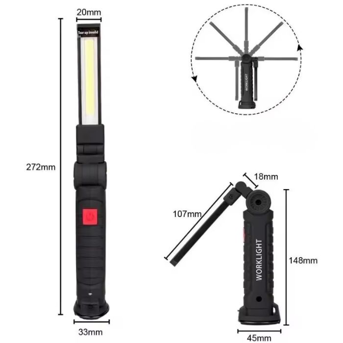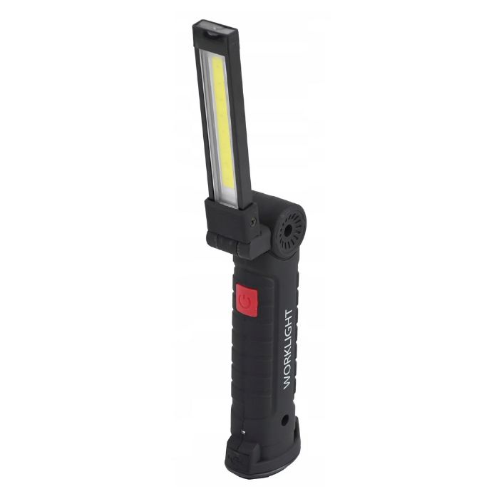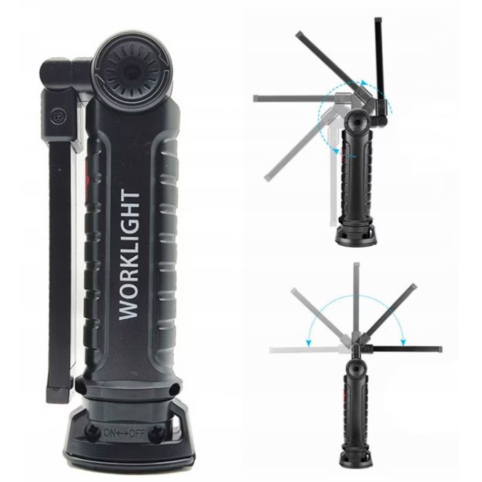 Професионалната работна лампа с мощен COB LED панел осигурява ярко и равномерно осветление, подходящо за различни работни и аварийни ситуации. Регулируемата глава позволява завъртане и прецизно насочване на светлината според нуждите, което я прави изключително удобна при ремонтни дейности и техническа работа.