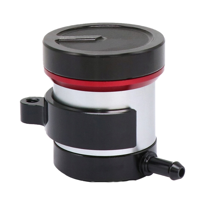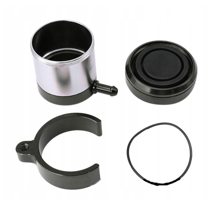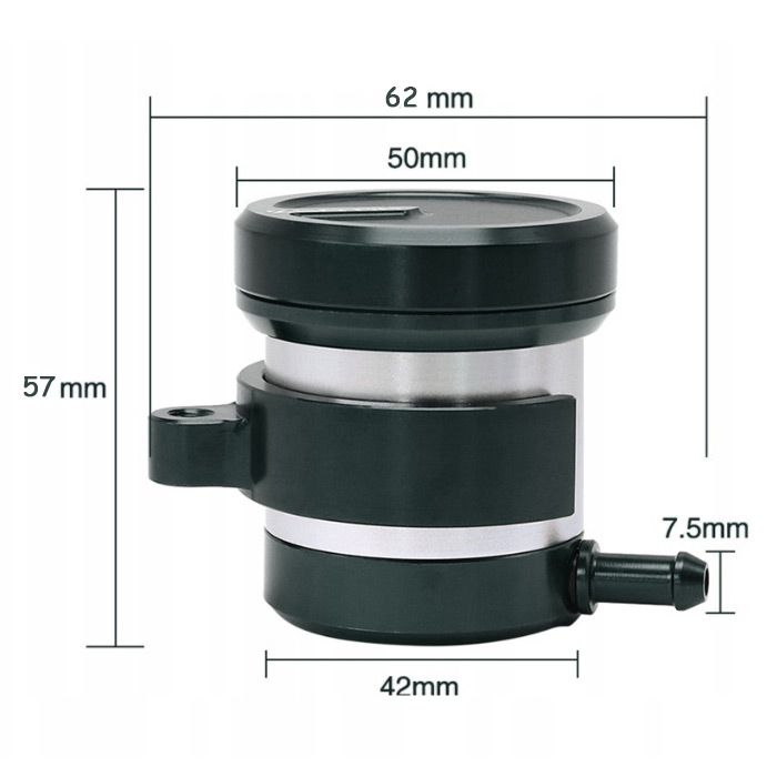 Този универсален резервоар за спирачна течност е изработен от алуминиева сплав и гумени уплътнения, което осигурява издръжливост и надеждност. Подходящ е за повечето мотоциклети и включва скоба за монтиране към мотора. Цвят: черно и сиво. Размерите са посочени на снимката, а цената е за 1 брой.