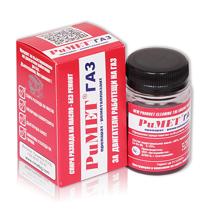 Специално разработена нанодобавка за двигатели, работещи на газ (LPG) или метан (CNG). Газовите горива ускоряват амортизацията на двигателя – РиМЕТ Газ/Метан възстановява и защитава износените зони чрез ултрадисперсна метална сплав (Cu–Sn), която се отлага само там, където има нужда.