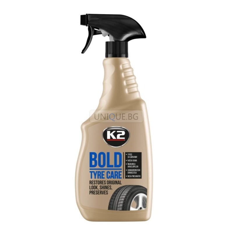 Описание: K2 BOLD е изключително ефективен и лесен за употреба почистващ препарат, специално разработен за грижа на гуми. Той възстановява оригиналния цвят на гумените елементи и осигурява дълбок блясък, придавайки на гумите изключителен външен вид.