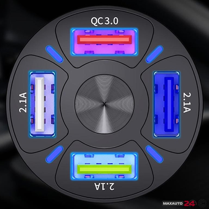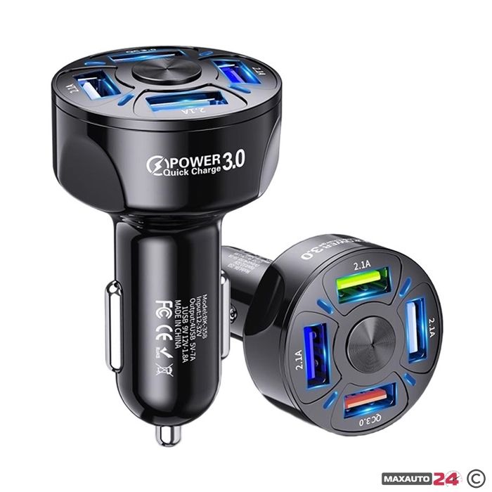 Този адаптер за зареждане разполага с три USB порта за бързо зареждане и един порт за много бързо зареждане 3.0, което ви позволява да зареждате едновременно множество устройства по време на пътуване. Подходящ е за смартфони, таблети, GPS навигация, банки за захранване и други акумулаторни електронни устройства. Адаптерът разполага с три USB порта с мощност 2.1A и един порт за Quick Charge 3.0. LED индикаторите показват състоянието на зареждането. Здравият захват в запалката предотвратява прекъсвания на захранването. Спецификациите са както следва: