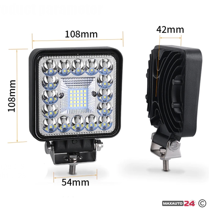 Размерите на халогена са 108мм х 108мм, а работната му температура е от -40°C до 85°C. Мощността на всяка светлина е 30W, като яркостта на светлината е 6000LM. Напрежението, на което работи, е от 12V до 24V, а цветът на светлината е 3000К. Типът на диодите е LED.