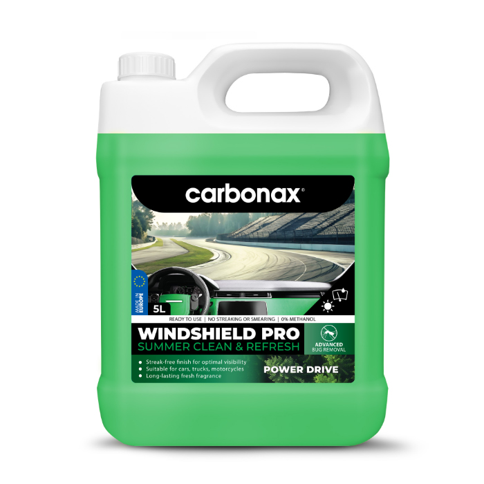 Шофирайте уверено през лятото с кристално чисто предно стъкло! Лятната течност за чистачки CARBONAX® Windshield Pro Power Drive ефективно премахва насекоми, прах, полени и упорити замърсявания, като оставя енергизиращ и ободряващ аромат.
